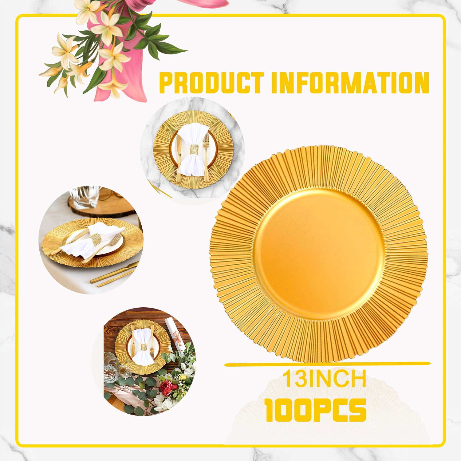 - 100 packes Great Value: Including 100 packes gold charger plates. Diameter is 13 inch, inner diameter: 9". Perfect for appetizers, salads, desserts, and cake! They are large enough to accommodate small to regular sized plates and bowls. Please note that in different light, the plates will have some color difference compared to the picture.